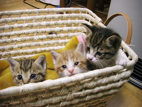 新緑の季節 ![]() アチコチで、子猫・子犬が保護されていて どこも満員状態 ![]() そんな中、今年は我が家には子猫こないなぁと 思っていたら(デッカイ顔して居座ってるヤツはいるが) 昨日、仕事帰りに三匹の子猫を保護しました ![]() ![]() ![]() 橋のたもとで、何やら困っている様子の 中学生の女の子たち。 ふと見ると、足元には小さ~い子猫。 思わず車を止めて、かけよりました。 「この猫が、道を渡ろうとしてたから 危ないと思って、拾ったんやけど・・・」 家には連れて帰れない、ってことです・・・。 じゃあ、オバチャンが連れて帰るからね。と 少女たちを安心させたのはいいけれど 一匹と言うわけではないだろう・・・。 辺りの草むらを探してみたら いたいた。二匹。 元気にニャーニャー鳴いてくれて良かった ![]() とりあえず集合写真をアップします ![]() か、かわええ~ ![]() ![]() 生後約一ヶ月くらい。 スリスリと甘えてくる様子から見ても 寸前まで飼われていたと思われます。 健康状態は、いたって良好 ![]() 耳ダニ・ノミ・お腹の虫もナシ。 ふやかしをガツガツ食べて、水も飲めます。 ころころウンPも綺麗です。 体重は今日現在、450g前後です。 茶トラがオス。 後の二匹はメスです。 また一匹ずつの写真もアップしますので 里親希望の方、ドシドシお待ちしております ![]() ![]() PR この記事にコメントする